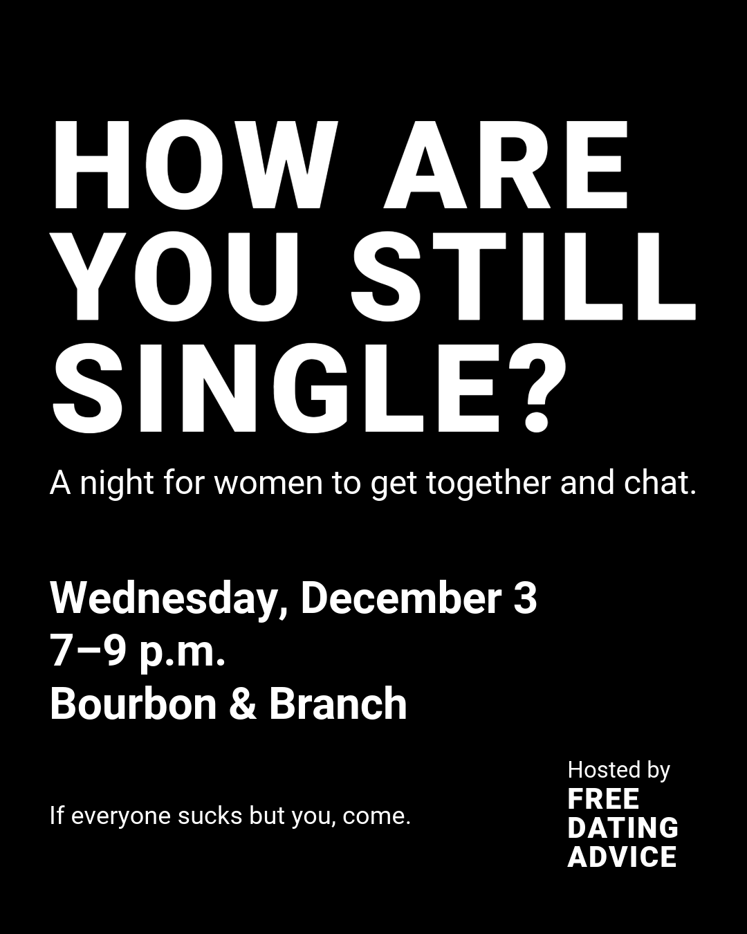 Join Free Dating Advice at Bourbon & Branch for a night of connection and conversation with other women who get it. We’ll have some fun and games while everyone settles in, then we’ll open up the floor for an IRL group chat. If everyone sucks but you, come.